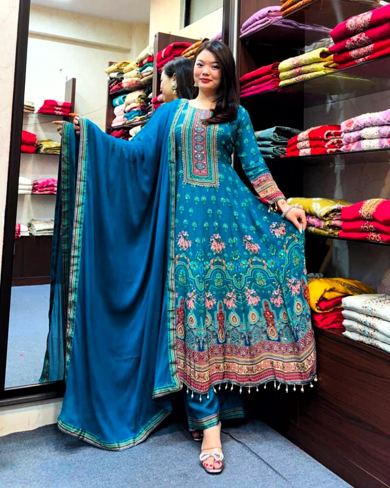 # WORK : PRINTED WITH FANCY EMBRODERY ORIGINAL MIROR WORK AND MOTI LACE WORK