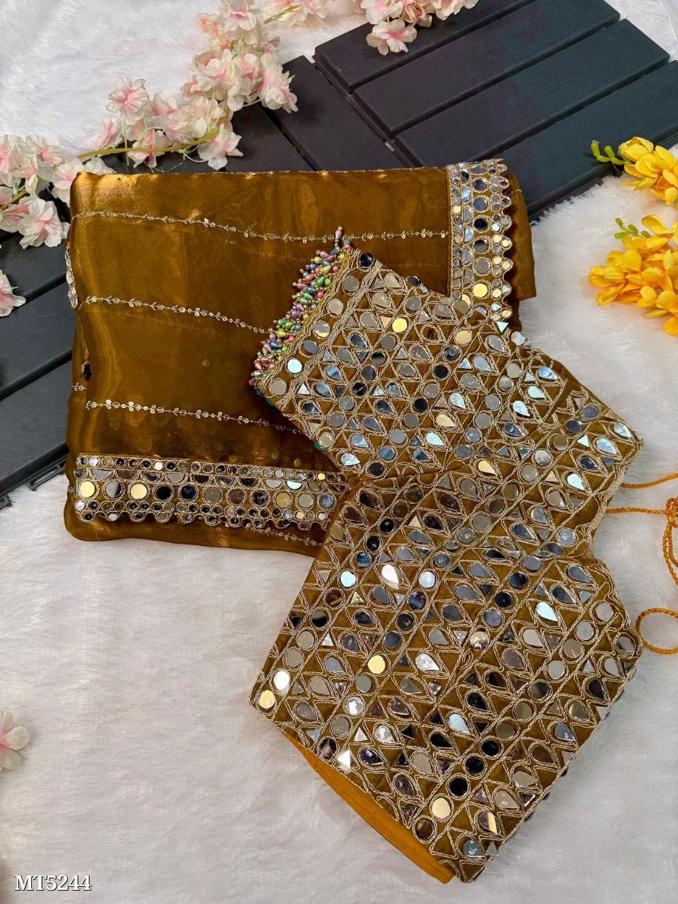 Allures your beauty and soothe your eyes . Here's yet another one of our saree collection which features Soft satin Organza saree which is embedded with real mirror work Embroidery all over the borders Comes with a a fully embellished standard sized Stitched blouse
